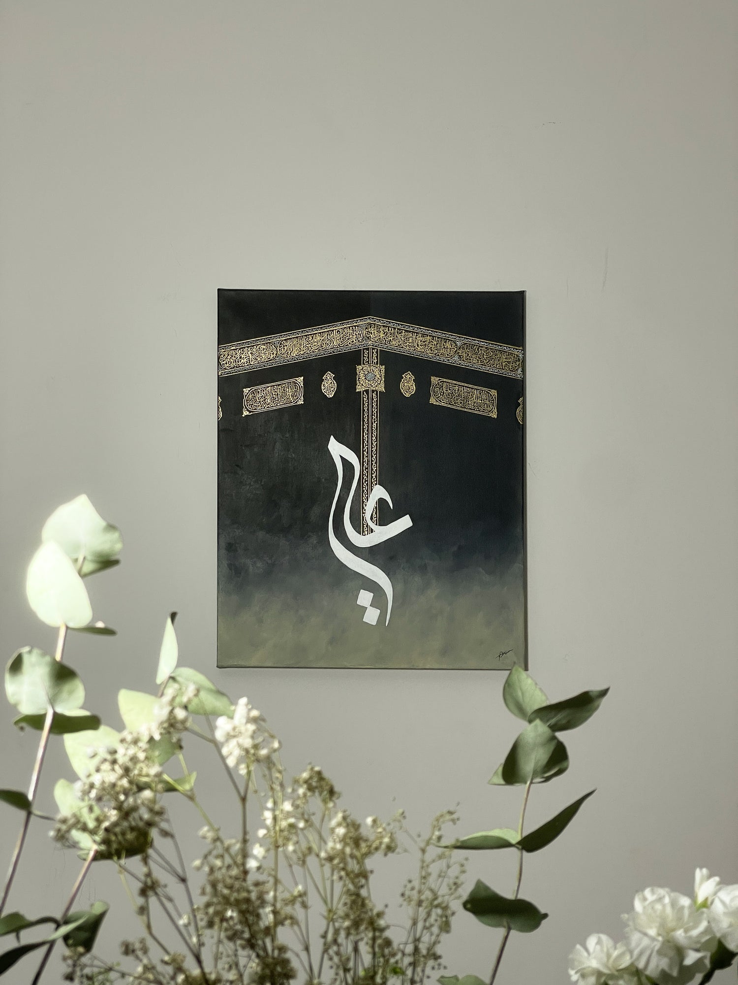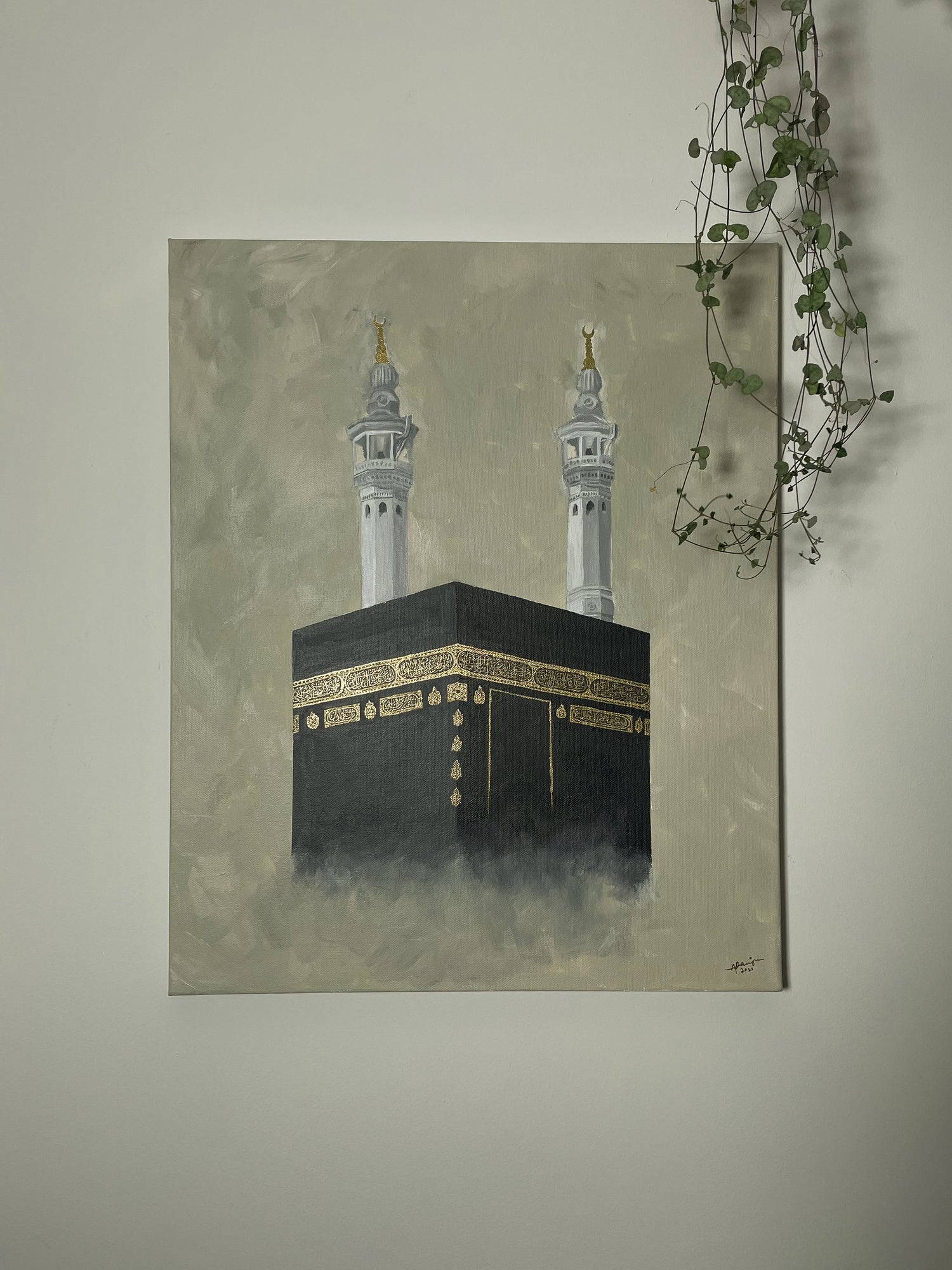 The elegant imagery of the Ka’aba and calligraphy has been created using acrylic paints on canvas.