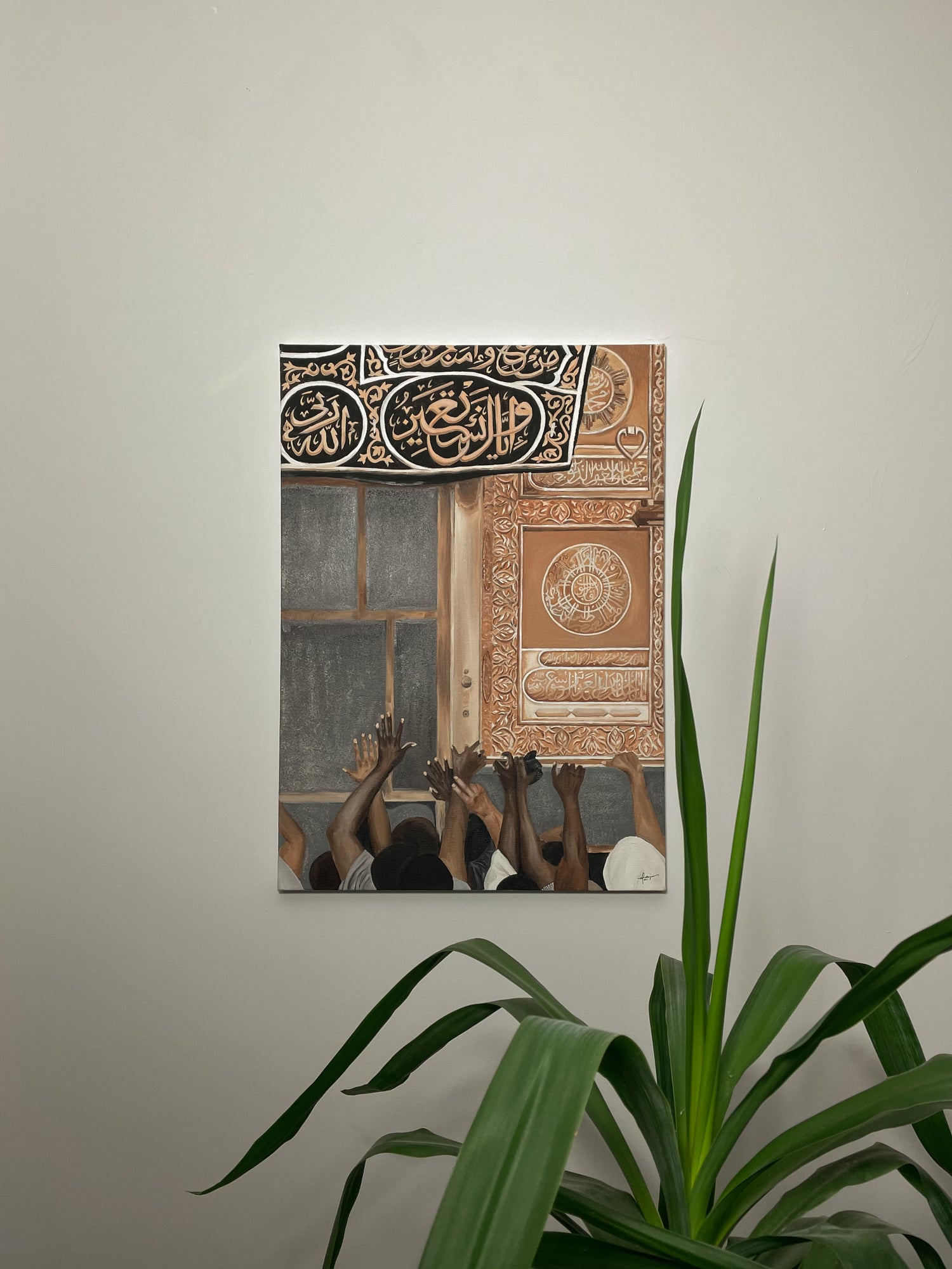 The vivid imagery by the door of the Ka’aba was painted using oil paints on canvas.