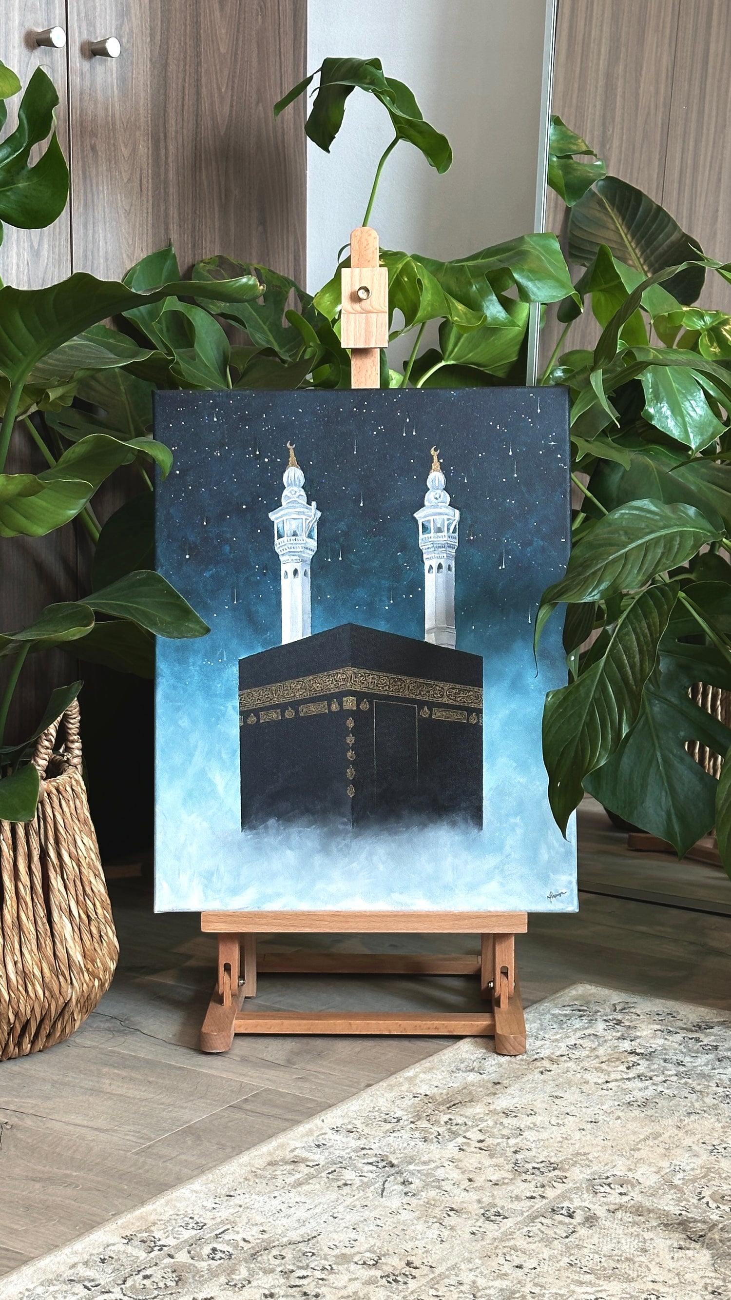 This piece is a limited edition of the Holy Ka’aba painting, inspired by the prominent imagery of stars in the holy Quran. The Quran often talks about the setting or falling stars which some scholars believe is a metaphor for the different verses and chapters of the Quran which came down from the heavens as guidance for mankind.