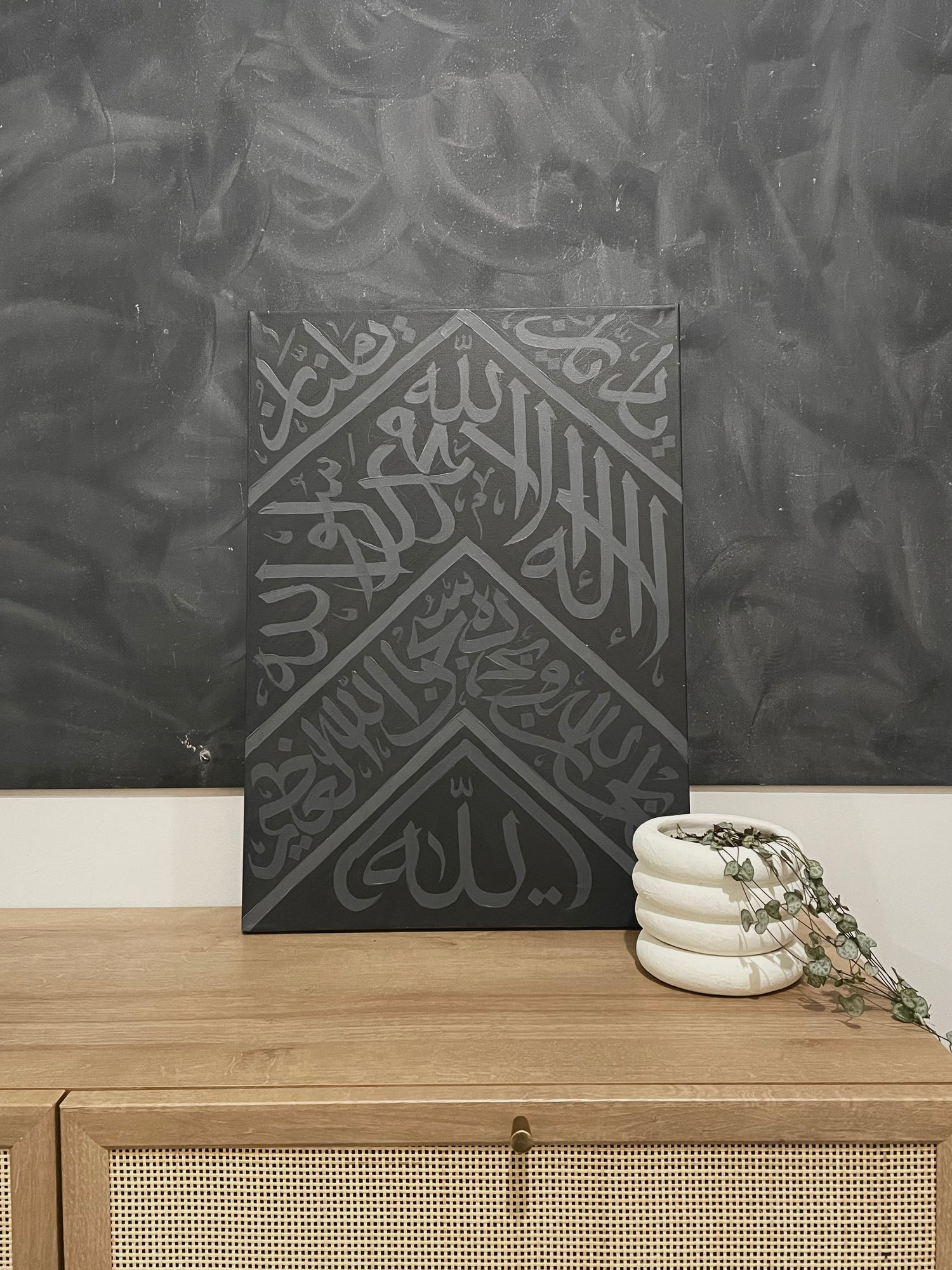 A simplistic deeper look into the cloth of the holy Ka’aba and the words woven into it. The painting transports you to the Holy Masjid al Haram and features the central creed of Islam – There is no God but Allah, Muhammad is His messenger.