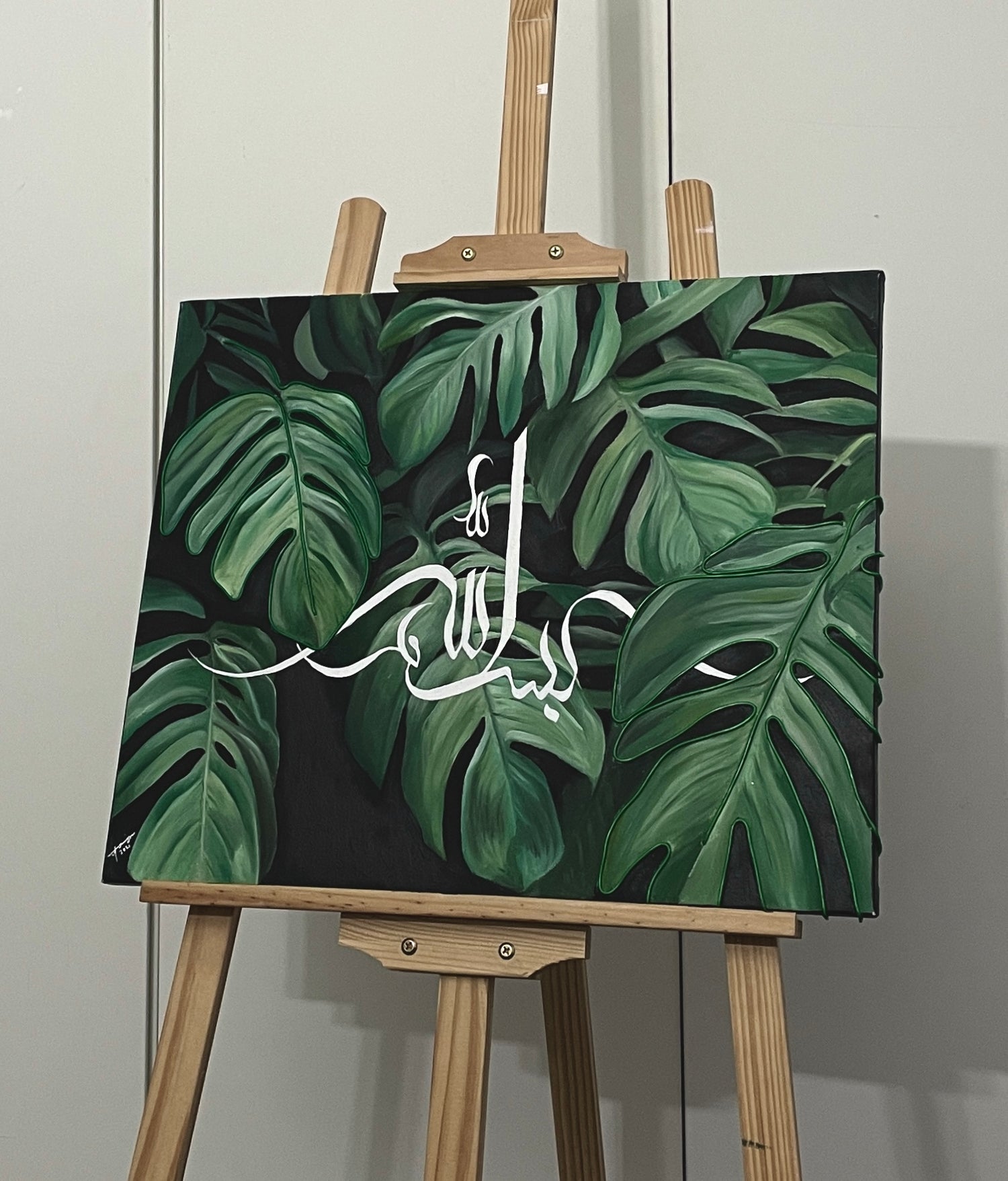Inspired by verse 64 in Surah Rahman, مدهامتان, is a reminder of the beautiful nature described in the holy Quran. The creation subtly weaves in neon green lights to beautify the painting, again inspired by Surah Rahman, the adornment of the Quran.